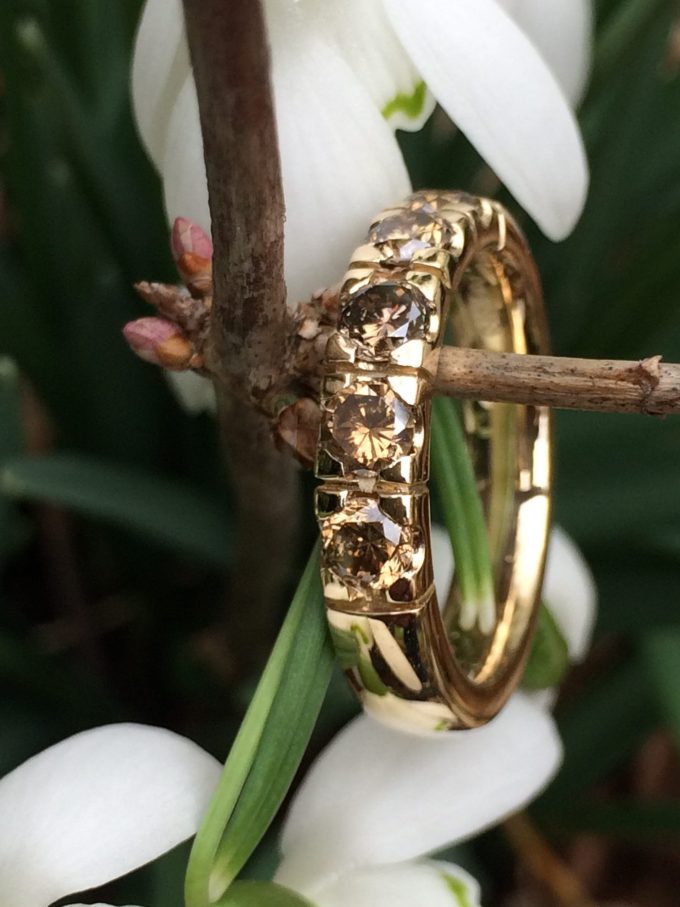 blød afrundet med 5 stk cognac farvet brillanter, a 0,20 ct pr stk