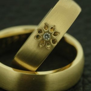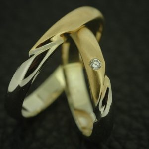 14 karats ringe, et par virkelig flotte ringe, kraftig, bløde og afrundet med 5 brillanter a 0,10 ct Twvs ialt 0,50 ct leveres i rødguld, Rose’guld samt hvidguld.